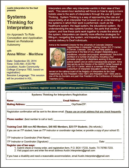 Austin Interpreters for the Deaf presents “Systems Thinking for Interpreters – An Approach To Role Conception and Application Based on Relational Autonomy” with Anna Witter – Merithew