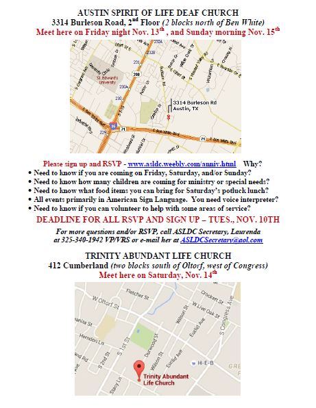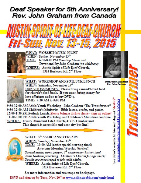 Special guest Deaf Evangelist John Graham from Ontario, Canada. To register, or get a flyer, see www.asldc.weebly.com/anniversary.html Awesome info and details in ASL – www.youtube.com/watch?v=qjdPbNh6l1M Pastor Debbie Stiles and all the ASLDC people want YOU to come celebrate!! Exciting preaching, sharing history, and special surprises happening!! DVDs of Saturday and Sunday’s events will be for sale! Opportunity for ASL students to get volunteer credit! http://vols.pt/53nzyA