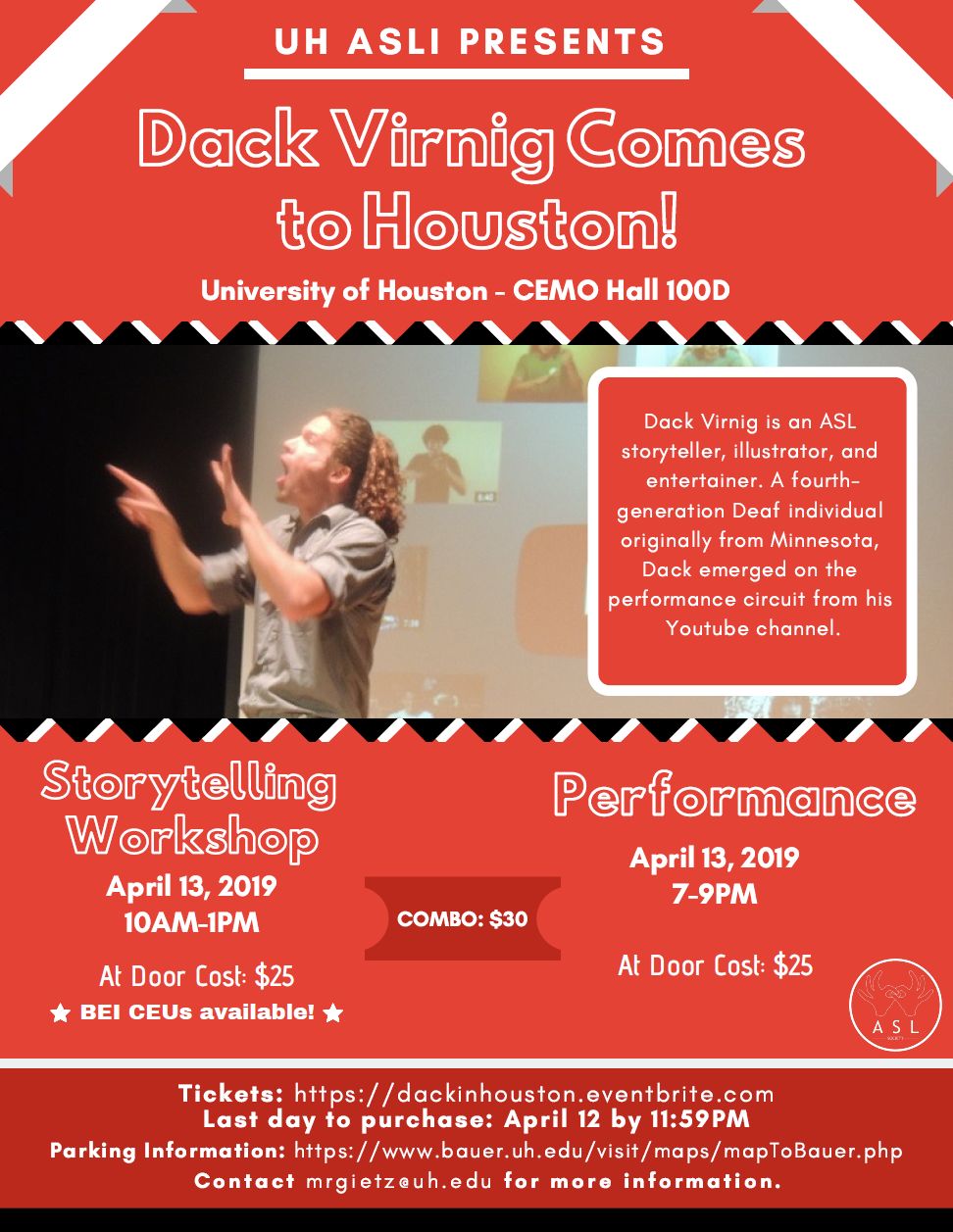 Dack Virnig is an ASL storyteller, illustrator, and entertainer. A fourth-generation Deaf individual originally from Minnesota, Dack emerged on the performance circuit from his YouTube channel.
